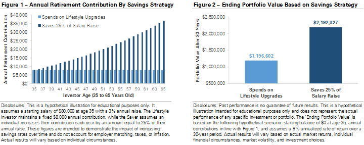 The charts below demonstrate how different approaches to a salary increase can impact a retirement portfolio’s growth. They’re based on a hypothetical scenario: two individuals aged 35 make $80,000 annually and receive 3% annual raises. Both start by contributing 10% of their salary, or $8,000, to retirement savings. The two sets of bars in Figure 1 track different strategies for managing the raises and retirement contributions. The Lifestyle individual keeps their annual contribution fixed at $8,000. Every dollar of every raise is spent on immediate lifestyle upgrades, such as a nicer car, another trip, or higher discretionary spending. The Saver individual takes a more balanced approach, setting aside 25% of every raise while enjoying the rest. For example, a $2,000 raise would increase the next year’s contribution by $500, or 25%.
